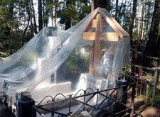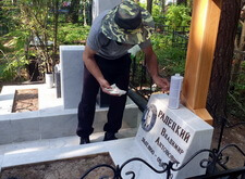 К сожалению, в самый разгар работы нас застал дождь. Так как реставрация требовала сухой погоды, то мы закрыли место захоронения плёнкой и покинули кладбище, отложив восстановление на несколько суток.
